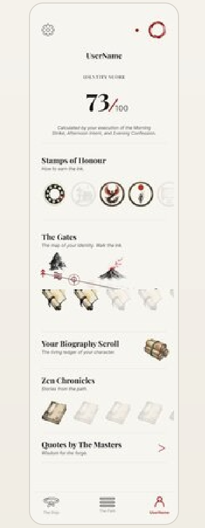 Not a streak counter. A living measure of who you are becoming — calculated from your Morning Strikes, Afternoon Intents, and Evening Confessions. Watch the number climb as the new identity takes hold.